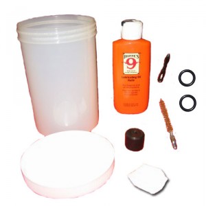 Smörjolja, borste, handtag till borste, bomullstrasor med hållare, 2 st o-ringar samt förvaringsburk.